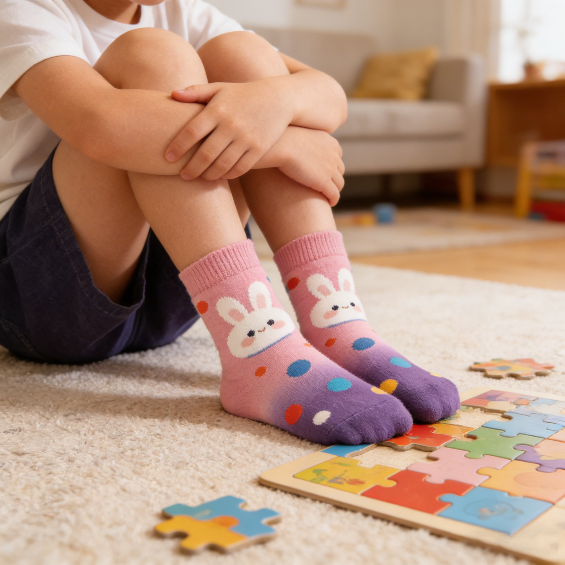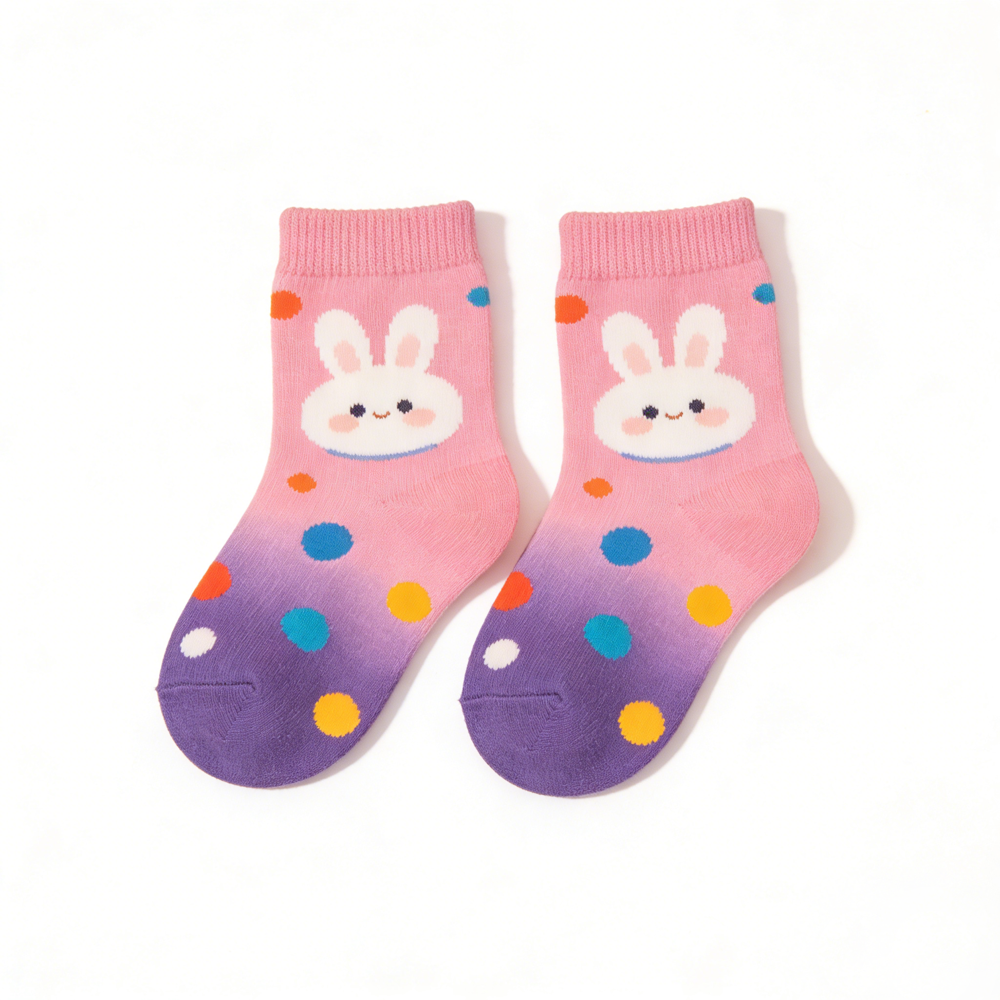 Gradient Pink-Purple Bunny Socks, soft combed cotton with pastel pink-purple gradient and cute bunny print. Size: One Size (Kids US 9-13). Sweat-wicking and stretchy, perfect for spring wear, cute styling and casual daily matching.