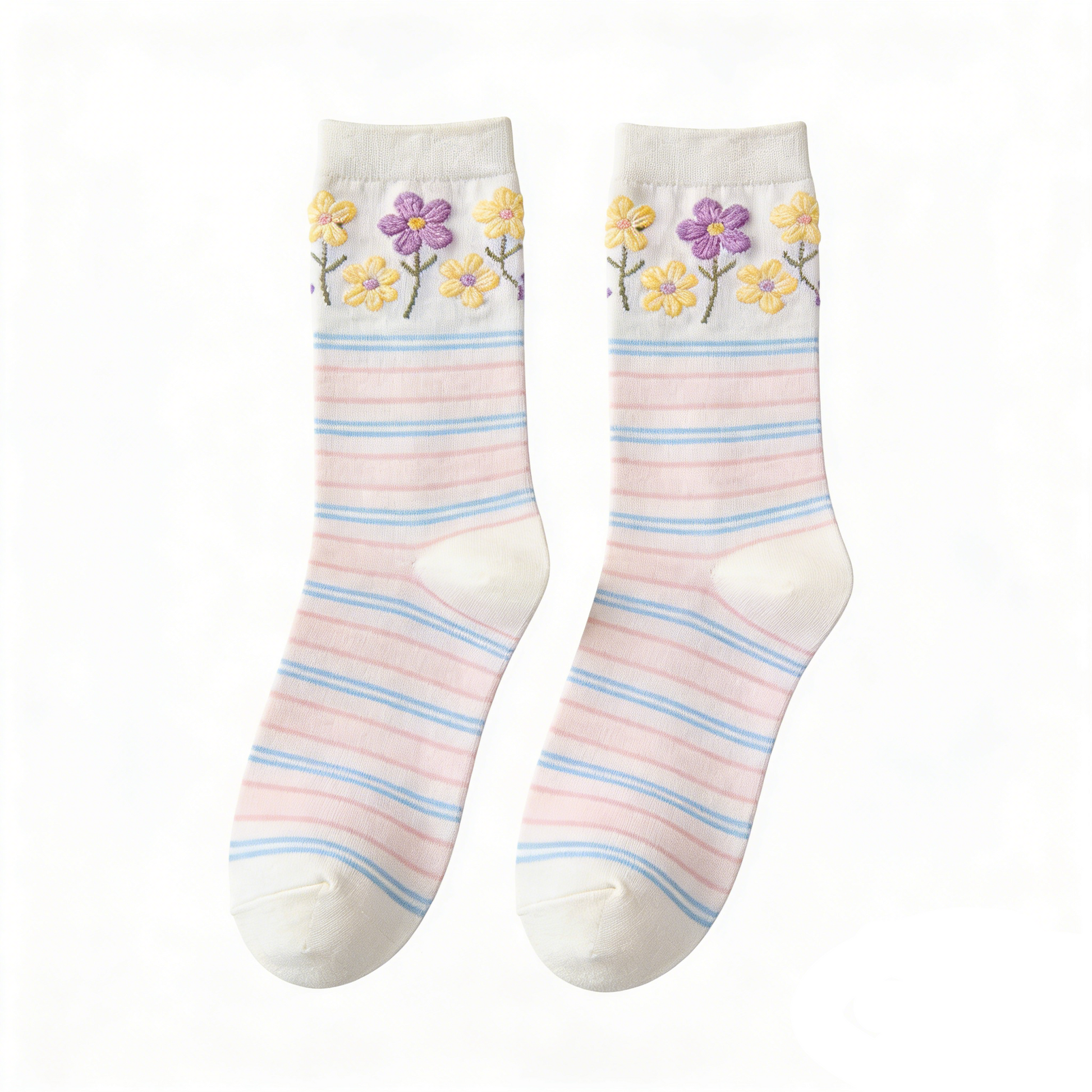 Pink-blue Thin Striped Mid-calf Socks with Yellow-purple Color Block & Small Flower Embroidery