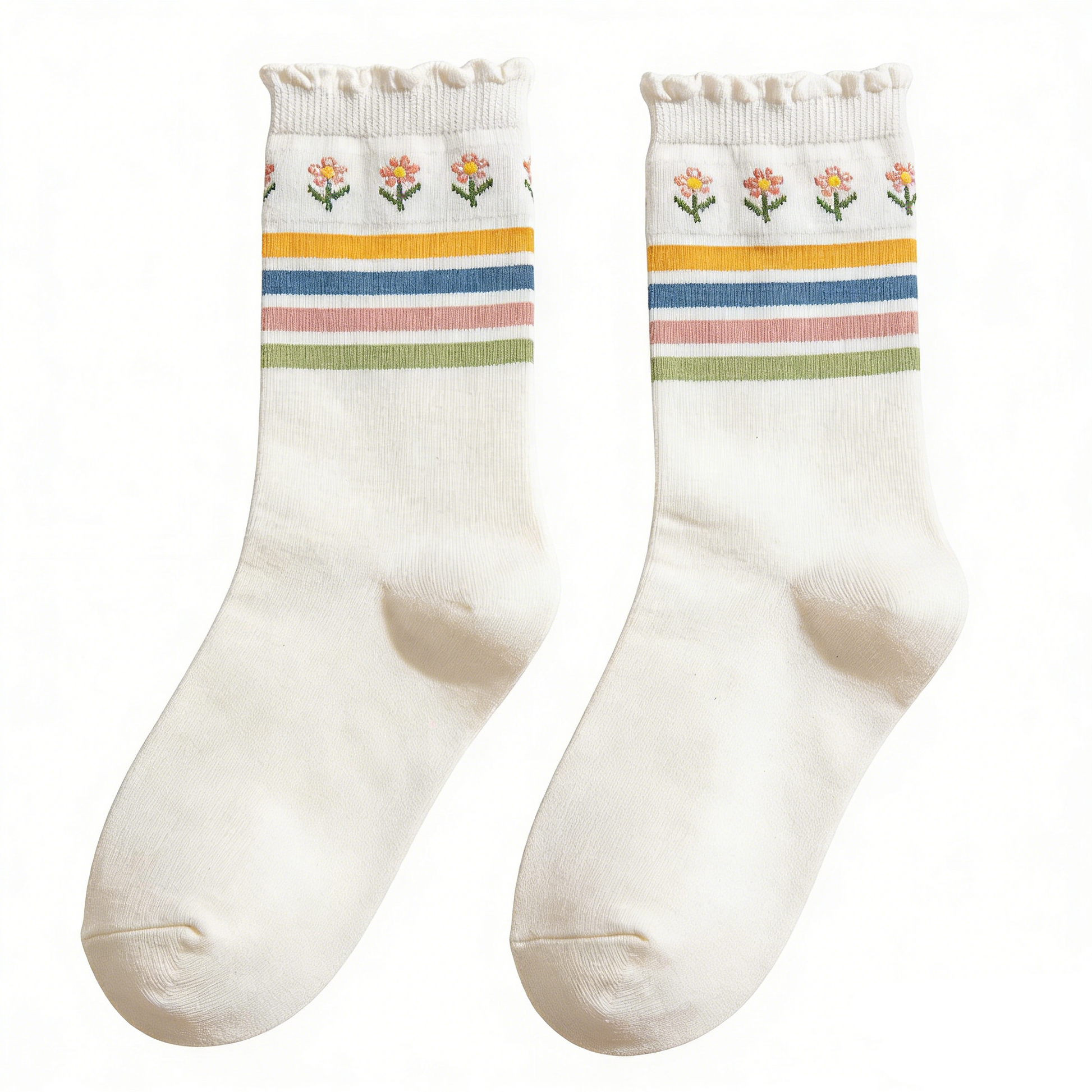 Ruffled Edge White Base Rainbow Striped Mid-calf Socks with Small Flower Embroidery